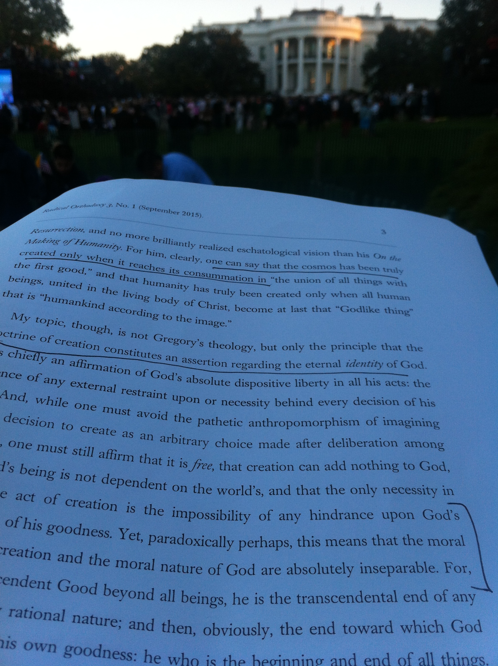 By the time I got onto the South Lawn, I was directed to the section in the far back. I forgot my prayer for a few minutes as I indulged in a bit of self-pity, but was invited out of myself again. With a couple of hours to go before the pope was scheduled to arrive, I tried to get some work done and stood reading a provocative article by Eastern Orthodox theologian David Bentley Hart. What resonated in this context was his argument that the doctrine of creatio ex nihilo—that God created from nothing and for no reason other than God freely wanted this good creation—puts infinite and eternal value on each particular thing: “But the story we tell, of creation as God’s sovereign act of love, leaves no room for an ultimate distinction between the universal truth of reason and the moral meaning of the particular and the moral nature of God.” All of creation, he continues to say, is theophany—a revelation, a disclosure, of the true nature of God.