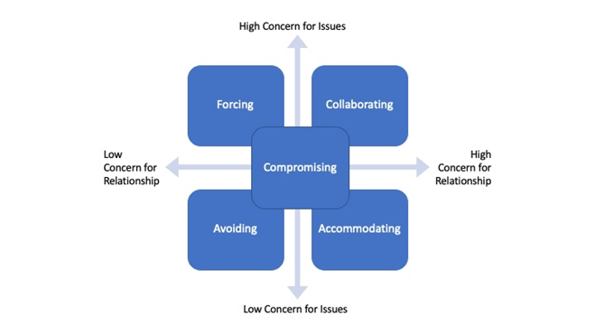 - Different types of response are appropriate for different conflicts. There are at least five types of conflict responses, each of which may be appropriate depending on the issues and relationships involved: forcing (“my way”), collaborating (“our way”), avoiding (“no way”), accommodating (“your way”), and compromising (“half way”).[2] While collaboration and compromise are crucial to long-term processes, like say democracy, all five types have a place in the proverbial toolbox.