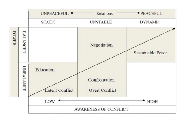 - Asymmetrical conflicts require conscientization and confrontation. The conflict responses above presume some awareness that a conflict exists. This may not be the case when the imbalance of power is great. Those benefiting from the status quo have little interest, and perhaps little occasion, to learn about the conflict. Not only that, those suffering from the conflict may have internalized oppression to such an extent that they too need conscientization and confrontation. In this way of understanding conflict, oppression is static and seeking peace requires a dynamic situation.[3] Peace is not the absence of conflict. Rather, peace is a state characterized by awareness and constructive approaches to conflict.