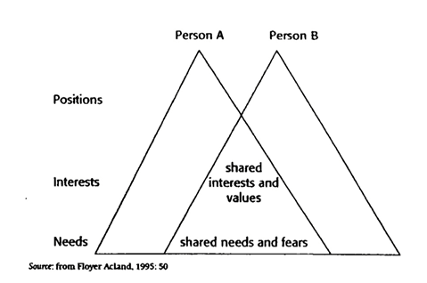 - Positions can be distinguished from underlying interests and needs. If people are not necessarily focused on survival, that is, if there is some balance of power, then they can use strategies honed by mediators. People usually enter mediation with established, if not rigid, positions on the issues at hand. Focusing on irreconcilable positions gets them nowhere. To shift attitudes and behaviors, they need to ask themselves questions like “what do I (we) really care about?” and “what is really at stake?” This conversation may make it evident that there are several positions that might satisfy one’s interests. Once begun, this excavation may uncover shared basic human needs, like security and belonging, that are mutually reinforcing, instead of relatively scarce.