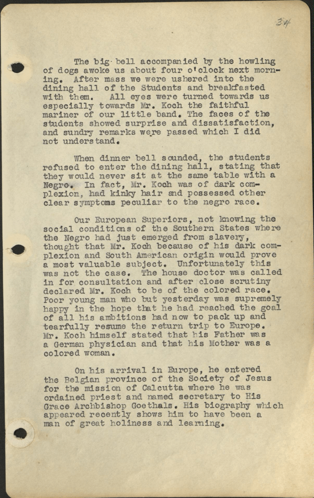 The above excerpt is from the memoirs of Albert Biever, S.J., who had entered the Jesuit novitiate with Hermann Koch in 1875. Biever recounts how “all eyes were turned…with dissatisfaction” when Hermann Koch and the other novices entered the room. He then describes how Koch was dismissed by the American Jesuits because he had “dark complexion, had kinky hair and possessed other clear symptoms peculiar to the negro race.”