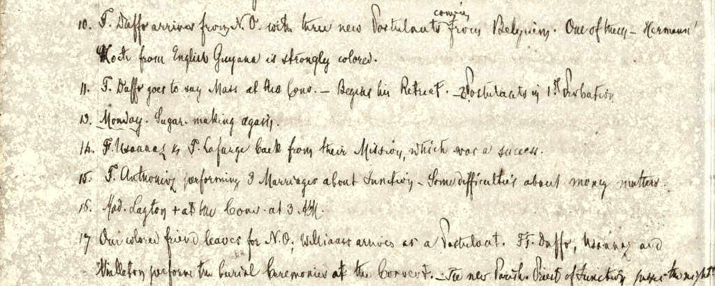 The Jesuit Minister’s Diary of Grand Coteau in 1875 announces that when three new postulants arrived at the novitiate from Belgium, “One of them, Hermann Koch from English Guyana is strongly colored” (top of image). Seven days later, he was dismissed, the diary entry reading “Our colored friend leaves for N.O.” (bottom of image).